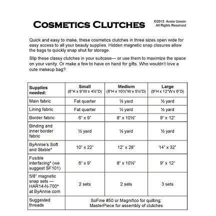 Dessa kosmetikaväskor ar snabba och enkla att tillverka i tre storlekar som öppnas helt för enkel åtkomst till alla dina skönhetsprodukter. Dolda magnetiska tryckknappar gör att väskorna snabbt kan stängas för förvaring