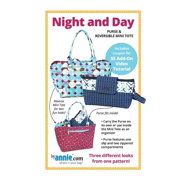 Mini Tote har handtag och knytstängning. Den är vändbar för två roliga utseenden: en quiltad sida eller en icke-quiltad sida med en passpoalficka. Handväskans bärrem kan också fästas på ringarna på väskan.